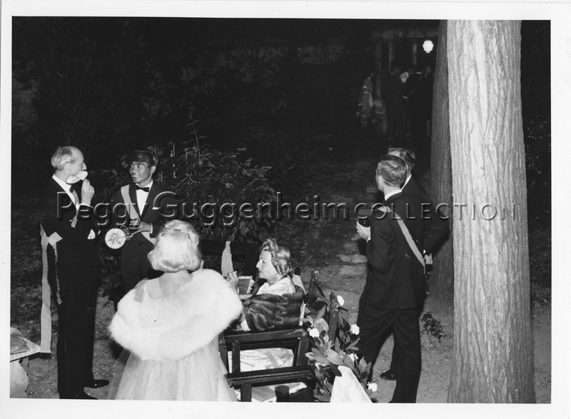 Charles Briggs (left) and the Cesellati sisters (center) at a party in the garden of Palazzo Venier dei Leoni, Venice, 1950s.