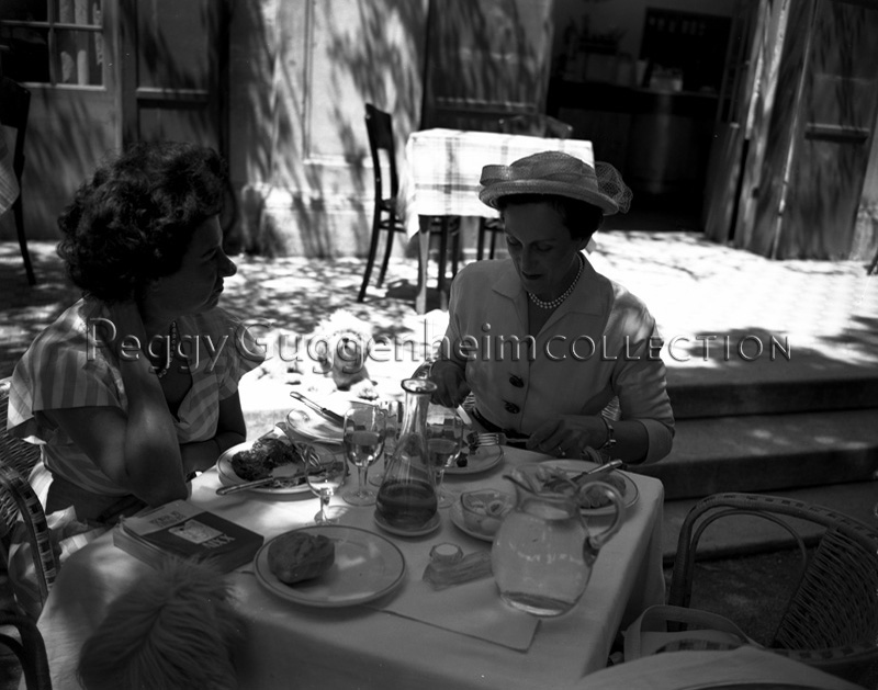 Peggy Guggenheim al tavolo di un ristorante, con la principessa Aspasia di Grecia, in occasione della Biennale d'Arte di Venezia del 1948