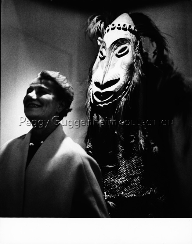 Peggy Guggenheim in cappotto bianco ad una esposizione d'arte, fine anni '50