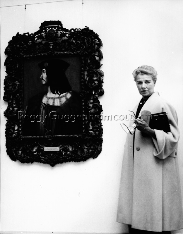 Peggy Guggenheim in cappotto bianco ad una esposizione d'arte, fine anni '50