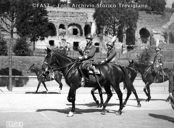 Il Re, Badoglio e altri ufficiali percorrono a cavallo Via S.Gregorio e passano in rassegna le truppe schierate