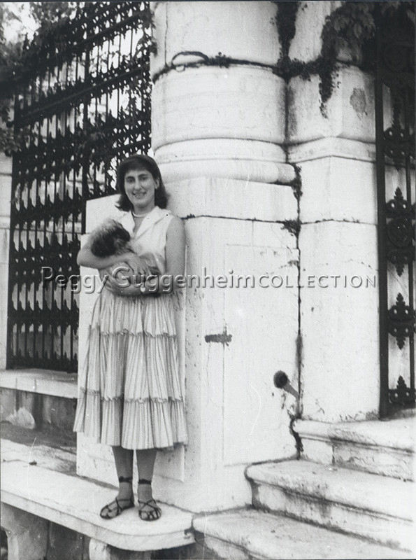 La moglie di Milton Gendel, Monica Incisa, con uno dei cani Lhasa Apsos di Peggy Guggenheim, in terrazza Marini di Palazzo Venier dei Leoni; Venezia, metà anni '50
