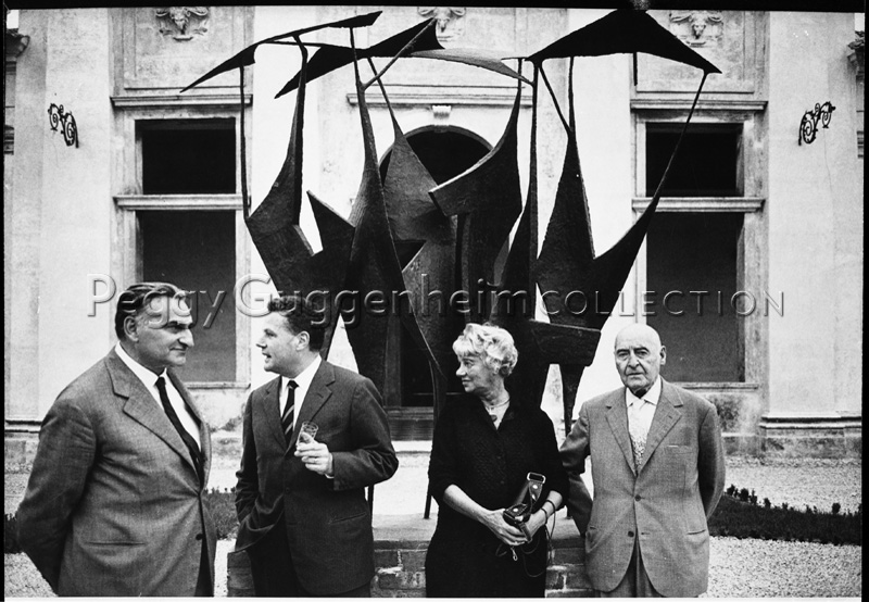 Peggy Guggenheim tra Carlo Corsi e Luciano Minguzzi, davanti a una scultura di quest'ultimo, primi anni '60