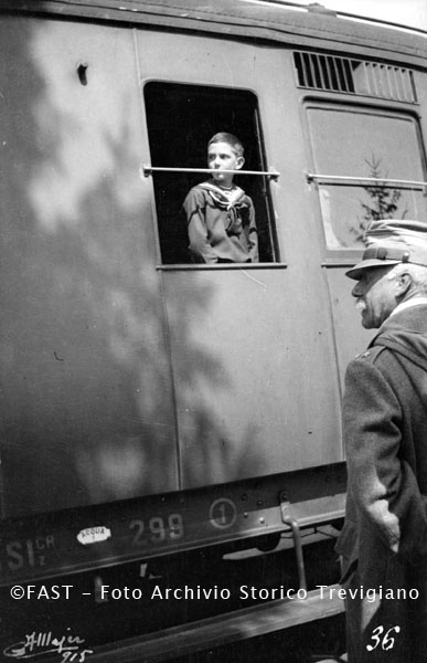 Un ufficiale saluta un bambino affacciato al finestrino del treno