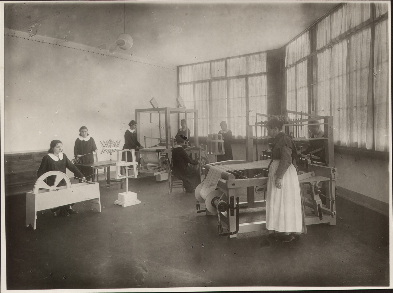 Foto di un gruppo di ragazze di un istituto per ciechi durante una lezione nel laboratorio tessile
