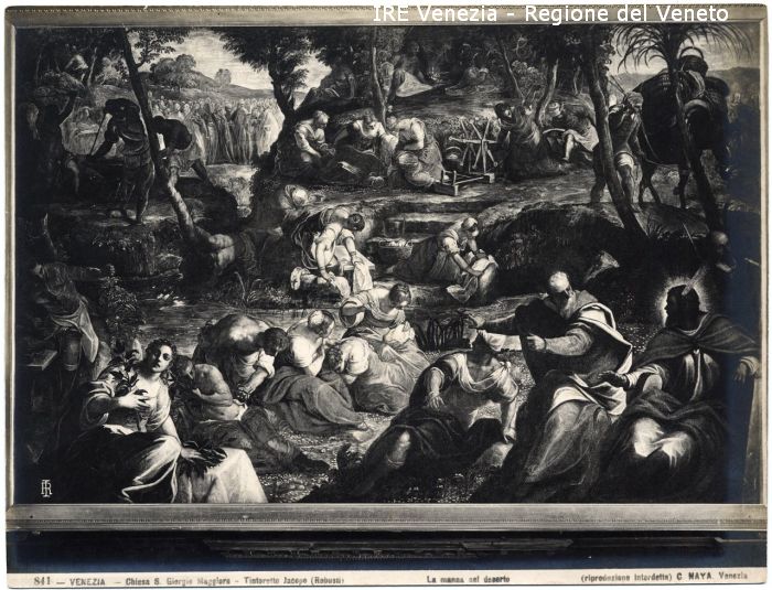 - ISCRIZIONI sul recto: in basso - 841 - VENEZIA - Chiesa di s. giorgio Maggiore - Tintoretto Jacopo (Robusti)/ La manna nel deserto/ (riproduzione interdetta) C. NAYA Venezia - fotografica -