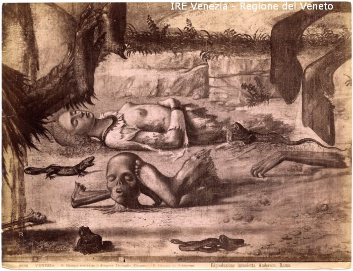 - ISCRIZIONI sul recto: in basso - 11889 - VENEZIA - S. Giorgio combatte il dragone Dettaglio(Carpaccio) S. Giorgio de Schiavoni/ Riproduzione interdetta - Anderson, Roma. - fotografica -