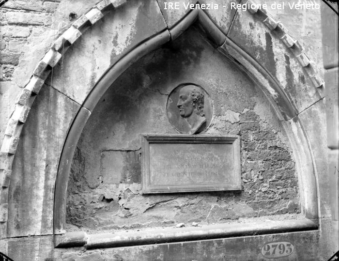 Venezia, Ca' Centani a San Tomà, particolare del portale con ritratto e iscrizione a Carlo Goldoni