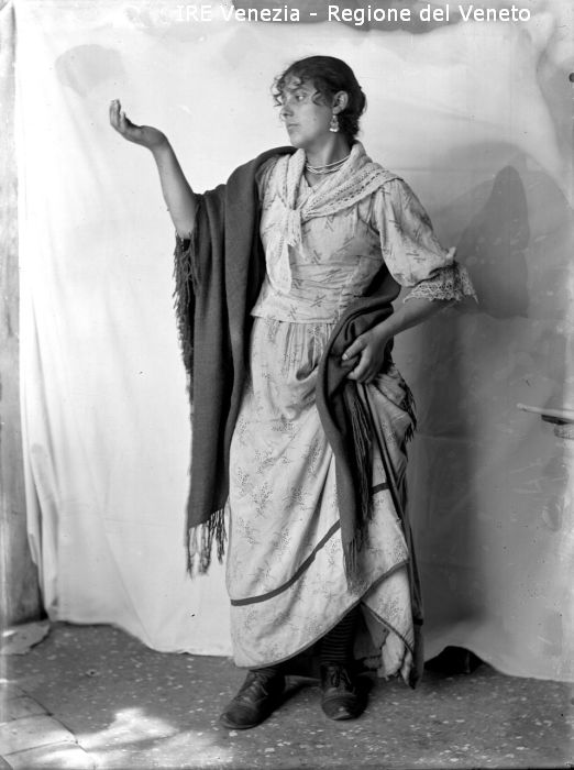 Venezia - Vita veneziana e lagunare - Scene e costumi - Scene di genere - Modella in posa: in studio; in foggia di popolana - Ritratto a figura intera - Una mano alzata e una a tenere il vestito