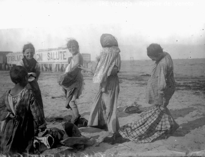 Sottomarina, bambini sulla spiaggia dello stabilimento Bagni Salute di Filippi, Tomaso (fine XIX)