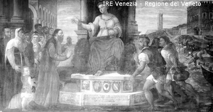 Venezia, palazzo Ducale, riproduzione dipinto, V. Buonconsiglio, "L'omaggio dei nicolotti a Venezia"