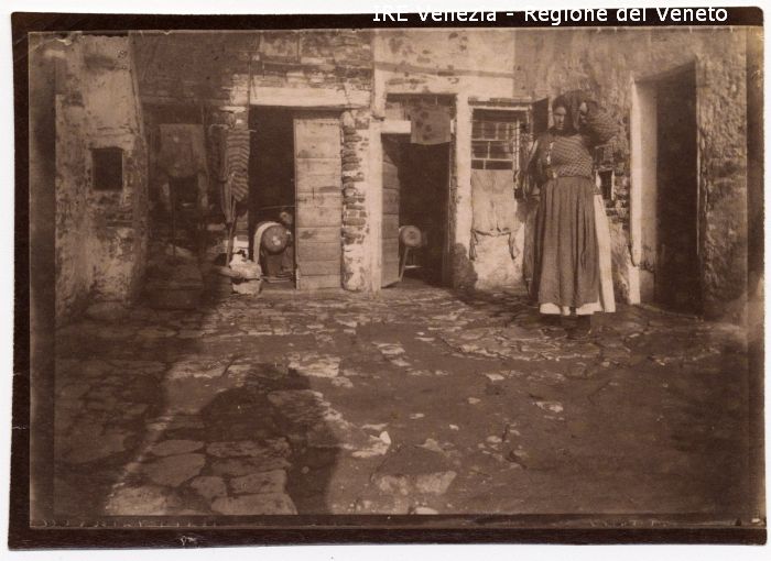 Venezia - Vita veneziana e lagunare - Scene e costumi - Momenti di vita quotidiana - Produzione di merletti - Località non identificata (Murano ?) - Corte - Abitazioni: ingresso - Donne al tombolo - Merlettaie
