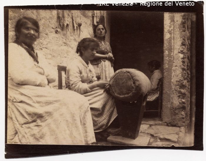 Venezia - Vita veneziana e lagunare - Scene e costumi - Momenti di vita quotidiana - Produzione di merletti - Località non identificata (Murano ?) - Soglia di abitazione - Donne al tombolo - Merlettaie