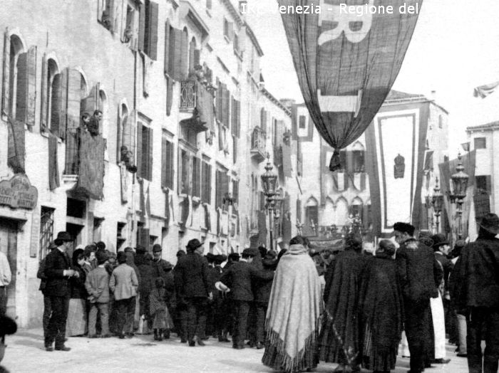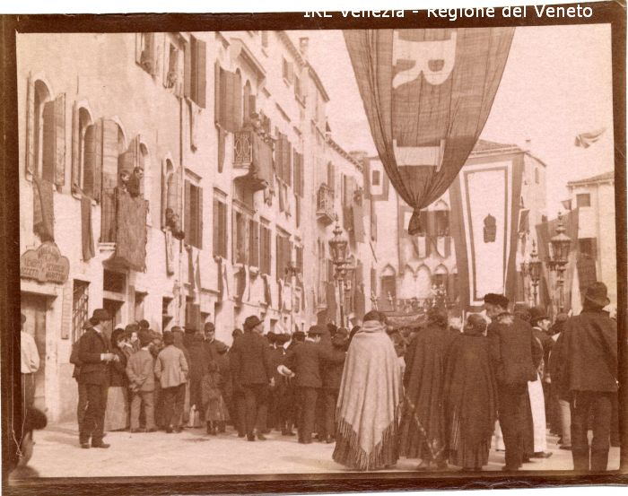 Venezia - Vita veneziana e lagunare - Scene e costumi - Luogo non identificato: campo Manin? - Drappo: Regno Italiano - Stendardi: con stemma reale - Folla - Persone alle finestre - Bottega: "vendita petrolio e oggetti marittimi"