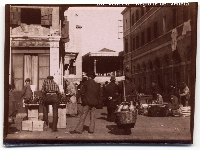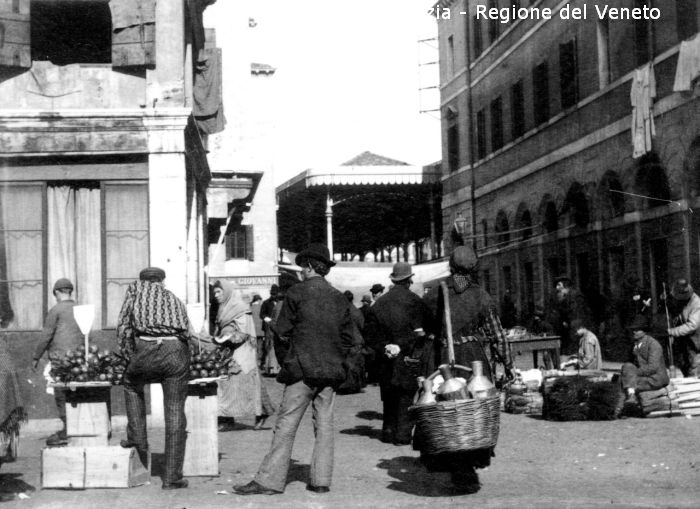 Venezia - Vita veneziana e lagunare - Scene e costumi - Mercato, negozi, bancarelle - Rialto - Campo Cesare Battisti già della Bella Vienna - Botteghe - Ambulanti - Passanti - Scene di mercato - Mercato coperto
