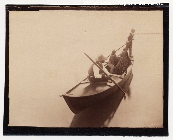 Venezia - Vita veneziana e lagunare - Modelli in posa per scene di genere - Laguna di Venezia - Ponte ferroviario - Imbarcazione: tipo di gondola - Passeggeri