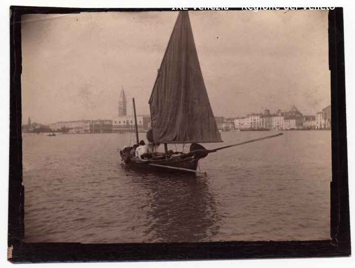Venezia - Vita veneziana e lagunare - Scene e costumi - Pesca in Bacino di S. Marco: verso Riva degli Schiavoni - Imbarcazione: topo, armato con vela al terzo - Pescatori