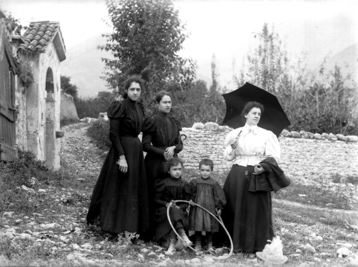 Componenti della famiglia Filippi - Ritratto: di gruppo, all'esterno - Donne: tre, in piedi - Bambine: due - Vestiario: abiti scuri - Ombrellini - Cerchio - Muretto - Alberi di Filippi, Tomaso (primo quarto XX)