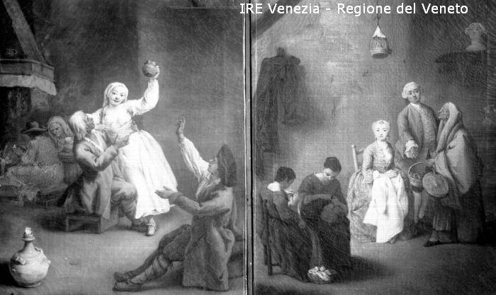 Venezia, Museo Civico, riproduzione dipinti, Pietro Longhi, scena d'osteria e "La scuola di ricamo"