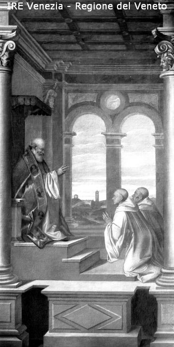 Venezia, Museo Civico, riproduzione dipinto, Domenico Campagnola, "San Romualdo e due monaci"