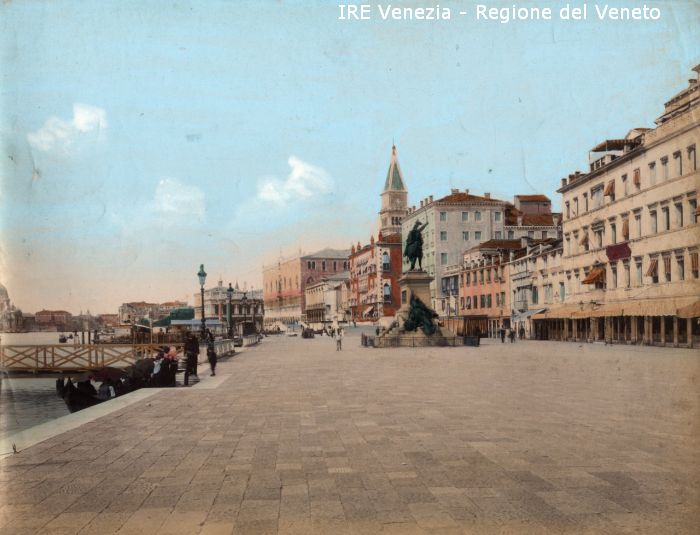 Venezia - Vedute, monumenti, luoghi - Centro storico - Area Marciana - Riva degli Schiavoni: ripresa da est - Monumento equestre di Vittorio Emanuele II - Ponte del Vin - Palazzo Bernardo o Dandolo (Hotel Danieli) - Prigioni Nuove