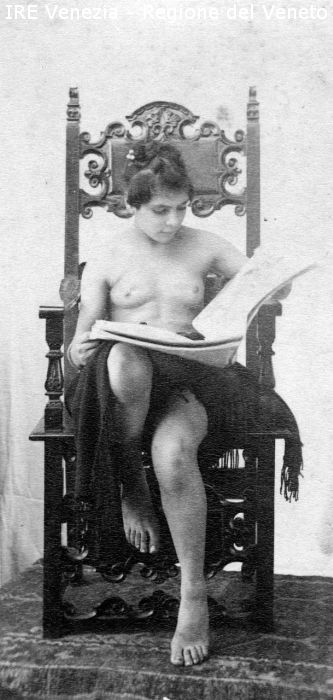 Venezia - Vita veneziana e lagunare - Modelli in posa per scene di genere - In studio - Ragazza: a petto nudo, seduta; che legge un giornale - Scialle nero - Piedistallo