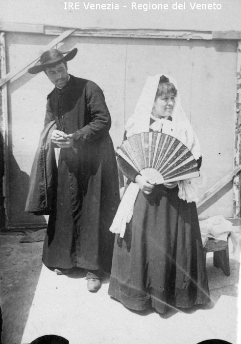Venezia - Vita veneziana e lagunare - Scene di genere - Esterni: una terrazza - Modelli in posa - Studio su figura di donna e uomo in foggia di prete
