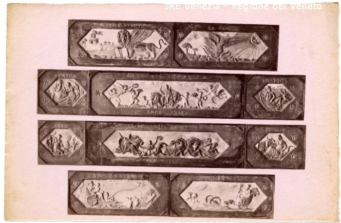 Iscrizioni sulle formelle (dall'alto verso il basso e da sx a dx): "STEMA VENETO"; "LA FENICE"; "AFRICA"; "GIOVANNI CAGNETO"; ANNO 1547"; "AMERICA"; "ASIA"; "GIOVANNI CAGNETO/ ANNO 1647"; "EUROPA"; "ARCO DE VENERE"; "CARRO DI NETUNO [sic]"