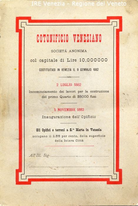 - ISCRIZIONI sul secondo supporto secondario: recto - COTONIFICIO VENEZIANO - VENEZIA/ SEDE ED OPIFICIO A S.ta MARTA - SUPERFICIE DEI FABBRICATI E TERRENI M.2 102,244 - tipografica -