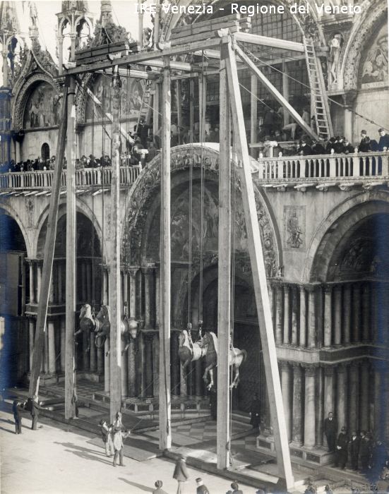 Venezia - Vita veneziana e lagunare - Prima guerra mondiale - Opere pubbliche - Opere di protezione - Ricollocazione dei cavalli marciani: cavalli che vengono issati sulla loggia della Basilica di S. Marco