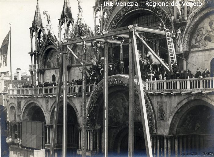 Venezia - Vita veneziana e lagunare - Prima guerra mondiale - Opere pubbliche - Opere di protezione - Ricollocazione dei cavalli marciani: cavalli che vengono issati sulla loggia della Basilica di S. Marco