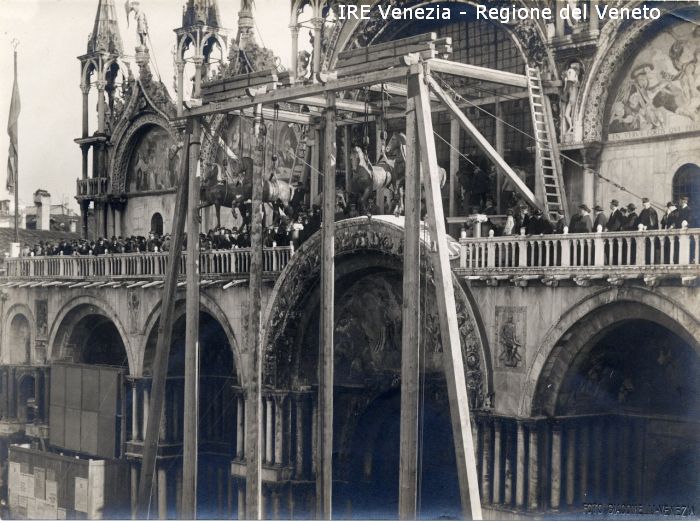 Venezia - Vita veneziana e lagunare - Prima guerra mondiale - Opere pubbliche - Opere di protezione - Ricollocazione dei cavalli marciani: cavalli che vengono issati sulla loggia della Basilica di S. Marco