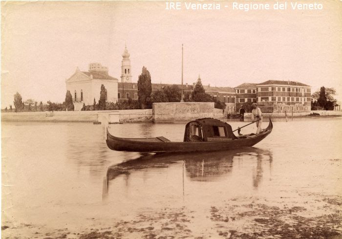 Venezia - Vita veneziana e lagunare - Isola di S. Lazzaro - Congregazione Mechitarista Armena - Veduta dell'isola ripresa dalla laguna - Gondola con felze - Gondoliere
