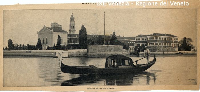 Venezia - Vita veneziana e lagunare - Isola di S. Lazzaro - Congregazione Mechitarista Armena - Veduta dell'isola ripresa dalla laguna - Gondola con felze - Gondoliere