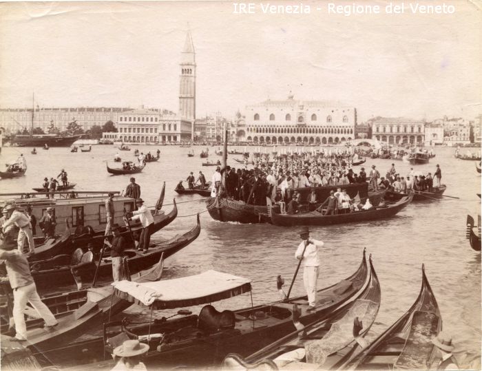 Venezia - Vita veneziana e lagunare - Scene e costumi - Manifestazioni religiose - Bacino di S. Marco - Imbarcazione: gondola, peata - Trasporto di partecipanti a una processione (del Corpus Domini ?) - Religiosi - Persone