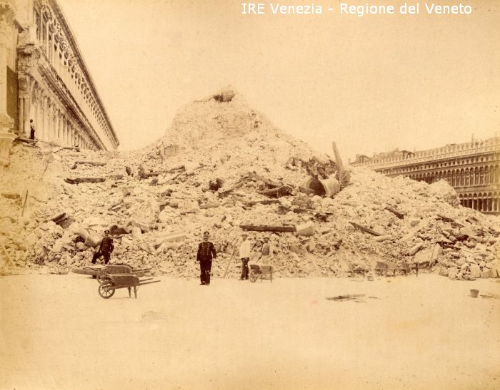 Venezia - Vita veneziana e lagunare - Attività pubbliche - Opere pubbliche - Campanile di S. Marco dopo il crollo: macerie in Piazza S. Marco - Uomini in uniforme - Operai al lavoro