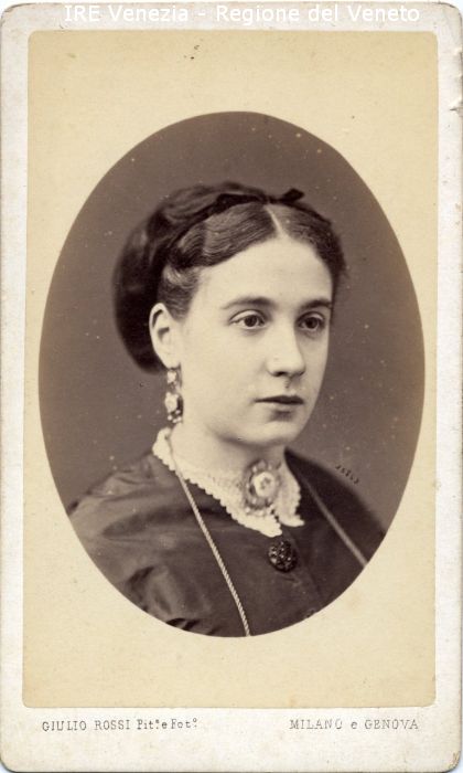 Ritratti: in studio; mezzo busto; in semi profilo - Donna - Acconciatura: capelli raccolti con un frontino - Vestiario: abito scuro con colletto di pizzo - Gioielli: orecchini, spilla - Sfondo