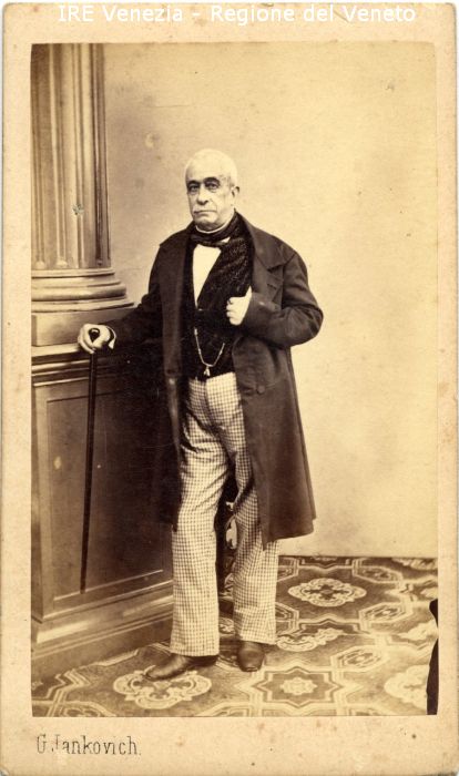 Ritratti: in studio; figura intera; frontale - Ritratto di Stefano Milomo - Uomo: anziano, con baffi; in piedi, con il braccio destro appoggiato a una colonna e un bastone nella mano destra