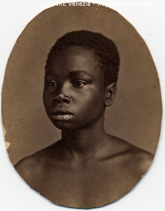 Ritratti: in studio; mezzo busto; in semi profilo - Ragazza: di razza africana - Sfondo
