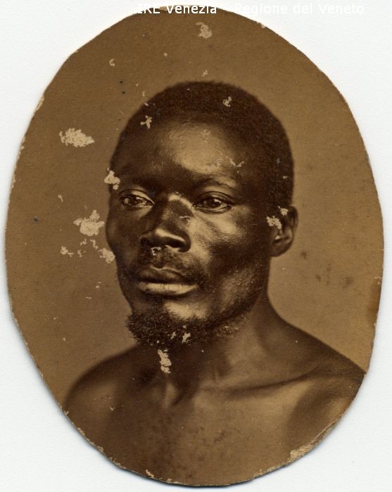Ritratti: in studio; mezzo busto; in semi profilo - Uomo: con baffi e pizzo; di razza africana - Sfondo
