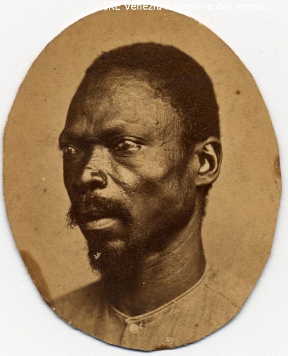 Ritratti: in studio; mezzo busto; in semi profilo - Uomo: con baffi e pizzo; di razza africana - Abbigliamento: camicia - Sfondo