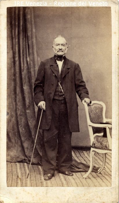 Ritratti: in studio; figura intera; frontale - Ritratto di Collodi - Uomo: anziano, con baffi e basette; in piedi, con un bastone nella mano destra e la mano sinistra poggiata sullo schienale di una sedia