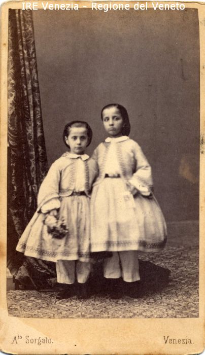Ritratti: in studio; figura intera; frontale - Bambine: due; a braccetto - Bambina a sinistra: in piedi, con un mazzolino di fiori nella mano destra - Bambina a destra: in piedi, con un foglietto nella mano sinistra - Vestiario: abiti chiari