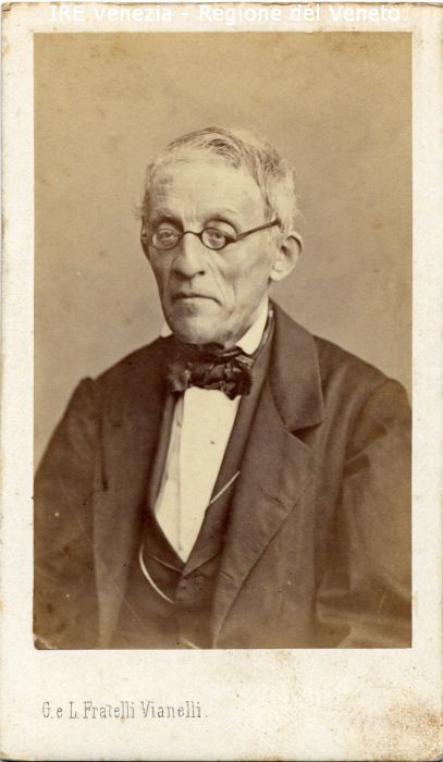 Ritratti: in studio; mezzo busto; in semi profilo - Uomo: anziano, con occhiali - Vestiario: giacca scura, gilét, camicia bianca; cravattino; orologio da taschino - Sfondo