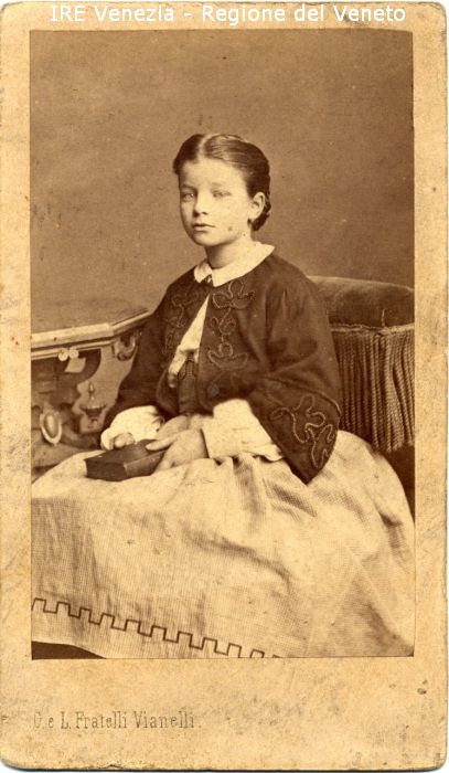 Ritratti: in studio; mezza figura; in semi profilo - Bambina; seduta, con un libro chiuso fra le mani - Acconciatura: capelli raccolti - Vestiario: abito chiaro, mantellina scura - Gioielli: orecchini