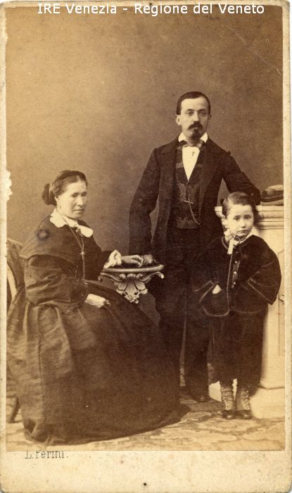 Uomo: con baffi e pizzo; in piedi - Vestiario: giacca e pantaloni scuri, gilét, camicia bianca; cravattino; orologio da taschino - Bambino; in piedi - Vestiario: abito scuro, scarponcini con ghette