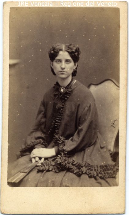 Ritratti: in studio; mezza figura; semi profilo - Donna: seduta, con un ventaglio in mano - Vestiario: abito scuro, mantellina con bordature plissettata - Gioielli: collarino - Arredamento: sedia imbottita - Sfondo