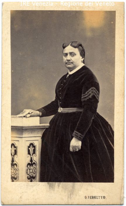Ritratti: in studio; mezza figura; in semi profilo - Donna; in piedi, con la mano destra appoggiata ad una colonnina - Vestiario: abito scuro con cintura, colletto bianco - Gioielli: orechhini; anello - Arredamento: colonnina a base quadrata
