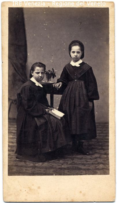 Ritratti: in studio, figure intere - Bambine: due - Bambina: a sinistra, seduta, in semi profilo, con un libro tra le mani - Bambina: in piedi, frontale, appoggiata ad un tavolino - Vestiario: abiti scuri con grembiule e colletto bianco
