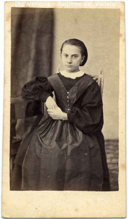 Ritratto: in studio, mezza figura, frontale - Bambina: seduta, con il gomito destro appoggiato ad un tavolino - Vestiario: abito scuro con grembiule e colletto bianco